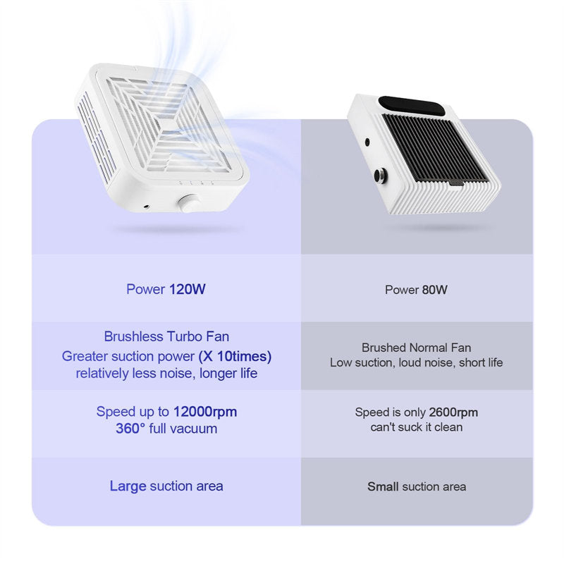 - Professional Dust Collector for Nails Salon: The brushless nail dust cleaner is 120W power, which is very powerful type in the marketplace. The maximum speed is 12000RPM, and three speeds can be adjusted.