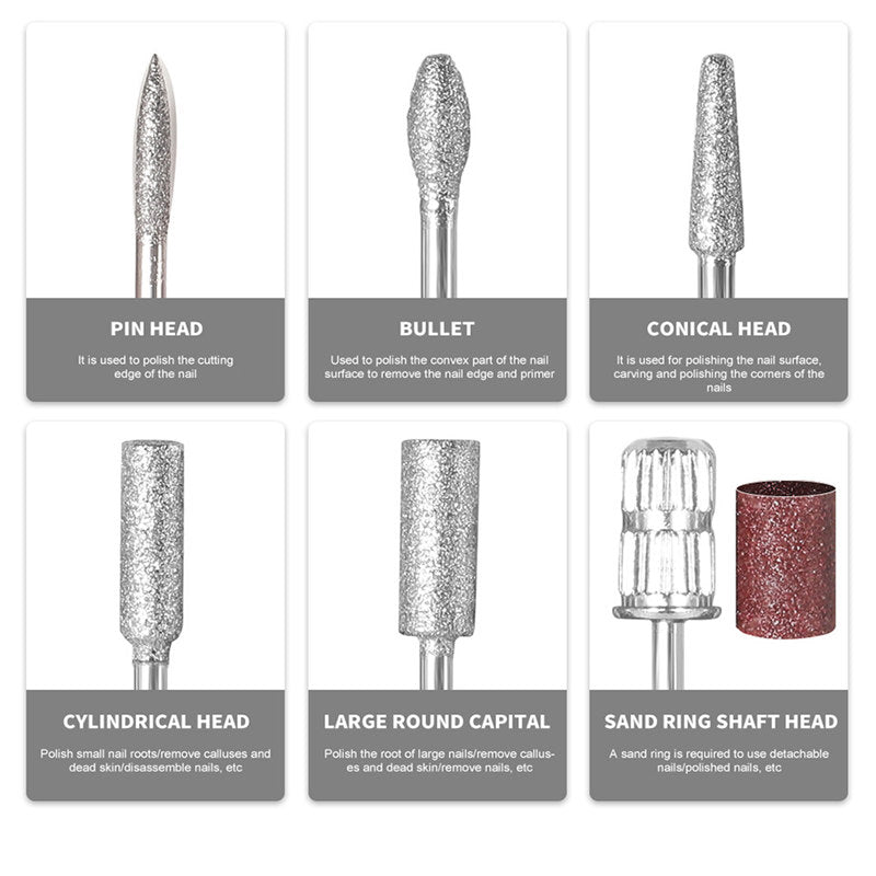 - Mult Nail Drill Bits Set: This comprehensive nail drill kit includes 6 drill bits set and 6 sanding bands, catering to all your manicure and pedicure needs. Whether you are shaping, smoothing, buffing, or polishing, you will have the right tool for every job, ensuring a flawless finish.