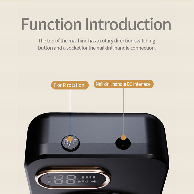 - Adjustable Speed & Direction: The electric nail drill has a speed control button to adjust the speed 0-45000 RPM, Seamlessly adjust the speed with a simple knob - clockwise to increase airflow and counterclockwise to decrease speed. The F/R switch on the side enables convenient direction changes.