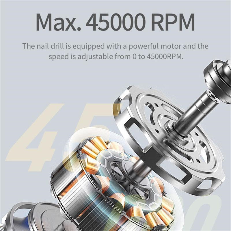 - Professional Electric Nail Drill: Our Portable upgrade electric nail drill is equipped with a powerful bearing, which works smoothly at a high and adjustable speed (max 45000 RPM) by rotating the speed control knob with ease.