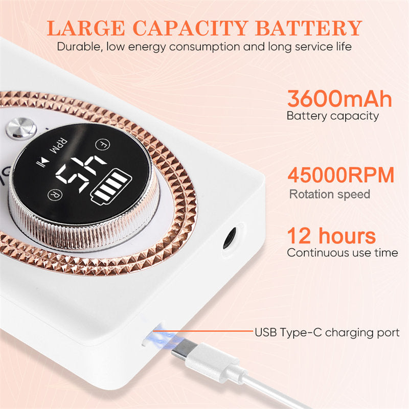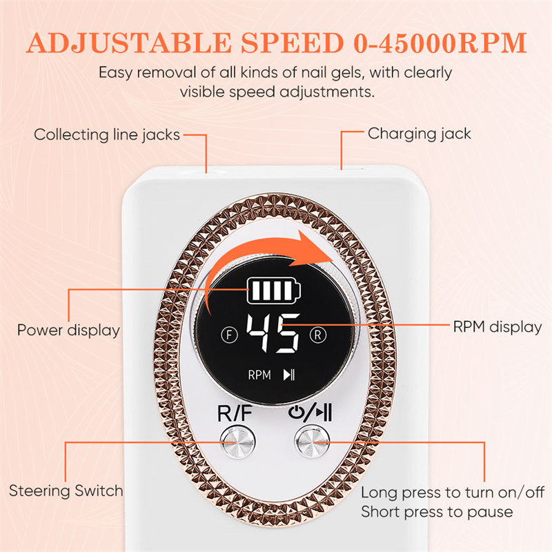 - Portable Nail Drills. Comes with USB interface(type-C), it can be easily used with any USB socket, such as power bank, laptop, ac adapter, and even car charger. The nail filing machine is equipped with an adjustable speed control button (0-45000rpm) and rotating forward/reverse direction, making it very convenient to use no matter whether you are left-handed or right-handed.