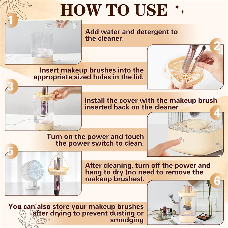 - Easy to Use: The cleaner is simple and straightforward to operate, add water and detergent, then insert multiple makeup brushes into the corresponding holes on the lid, close the lid, plug in the power supply, and touch the switch to clean automatically, or you can choose to hold the makeup brushes to clean individually, and you can hang them up to dry after cleaning.