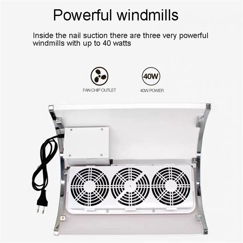 - Nail Dust Extractor: Nail Dust Extractor will help you to provide yourself and your friends or customers with beautiful, professional-looking nails in peace and cleanliness. The dust extraction with 3 powerful blowers provides the right suction power to vacuum dust from natural nails, acrylic and even gel nails. You will appreciate the quiet operation whether you use it at home or in a professional manicure salon.