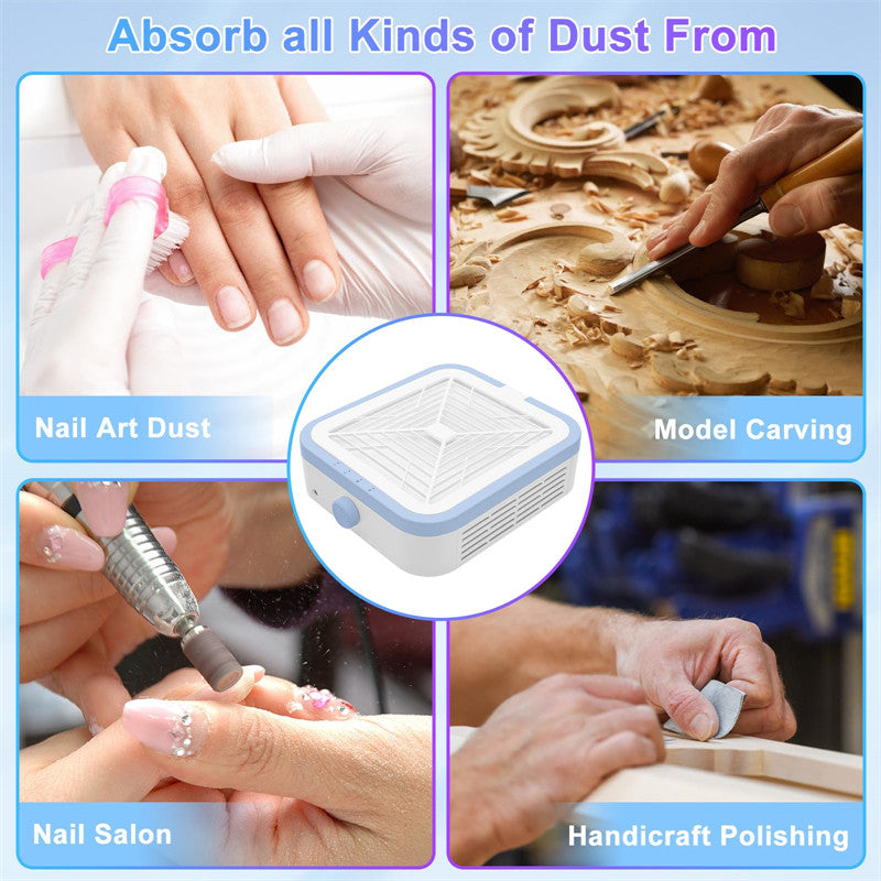 - Electric Nail Dust Collector 120W: This Brushless Nail Dust Cleaner protects you from dust. The dust collector for manicure has perfect effect, when you work with a nail drill, and the nail dust won't fly into the air. The Nail Dust collector is equipped with a reusable filter fan to collect dust while you use nail drill, nail file and buffer, or polish nails